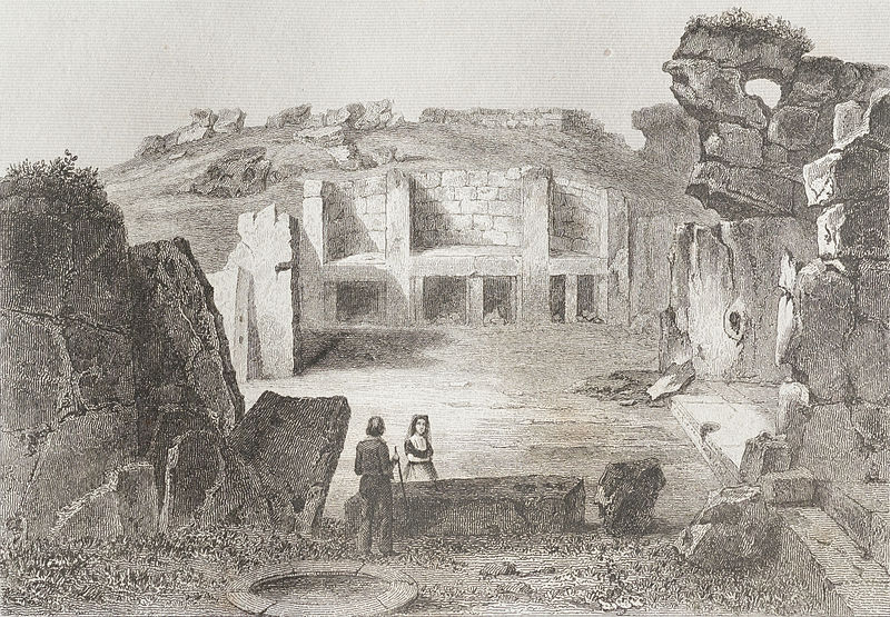 Engraving of the Ggantia megalithic temple in Gozo made in 1848.  Title: ‘Gozo (Giants’ tower)’. Photographer: Marie-Lan Nguyen (2013). Public Domain.