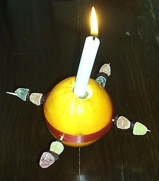The various parts of a Christingle represent different things. The round orange itself represents the world and the candle represents Jesus as the light of the world. The red ribbon (Christian faith) goes all the way round the world, its colour being a reminder that Christ died. The four cocktail sticks have two meanings: the four corners of the world or the four seasons. And lastly, the sweets (or dried fruits are sometimes used) are a reminder of God’s gifts to the world, including love and kindness. (The small circle of aluminium foil at the base of the candle is purely for collecting drops of hot wax.)