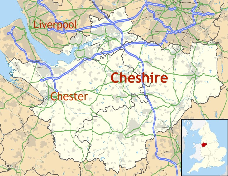 Map of Cheshire showing location of Chester. Source: Ordnance Survey OpenData. Author: Nilfanion, Creative Commons