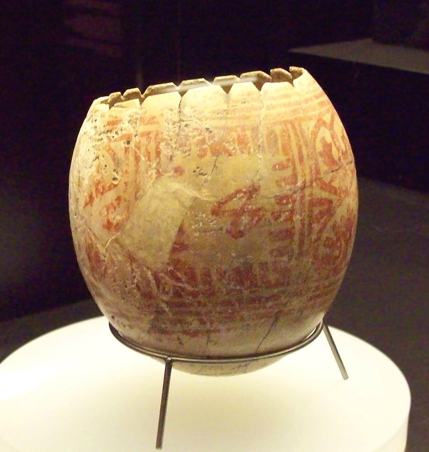 Ostrich egg shell with painted red lines. Punic artwork from Iron Age II. Current location: National Archaeological Museum of Spain. Photographer: Luis Garcia (Zarqarbal). Commons.