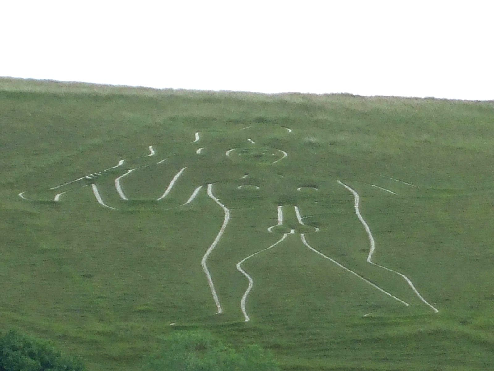 My second favourite hill figure is the Cerne Abbas Giant – also known as ‘The Rude Man’ or ‘The Rude Giant’ – and is one to make little old ladies blush and everyone else just giggle. He can be found at the village of Cerne Abbas near Dorchester in Dorset and we dropped by to say ‘hello’ to him four years ago. This is our picture of the figure as in can be seen from the road. It doesn’t show the complete outline too well, so I’ll add an image from Wikipedia: