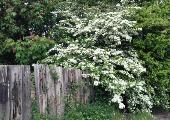 Hawthorn blossom next to pink horse chestnut, Early May 2017