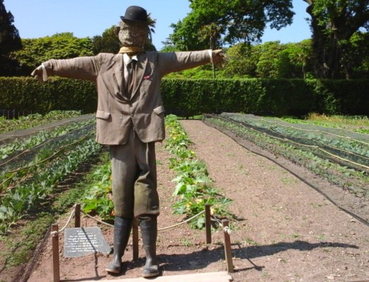 A scarecrow called Diggory in the kitchen garden doing his job in the vegetable plots