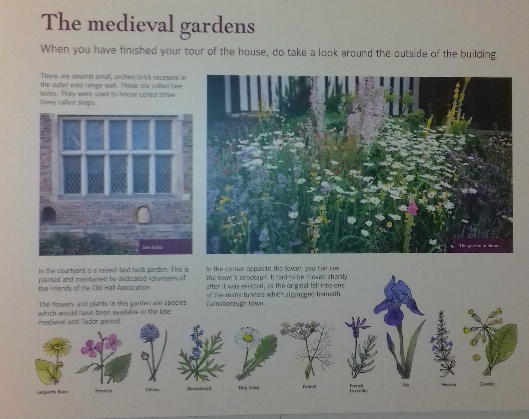 After a quick bite to eat in the Coffee Shop, we finished our visit with a look at the  Medieval Gardens. Although these cover quite a small area, they are interesting because the species of plants and flowers are mostly those that would have been grown in medieval times. A wall poster in the hall gave a list, which I photographed but it isn’t very clear unfortunately. If you click on it a couple of times it enlarges the flower and herb names across the bottom enough to be read: