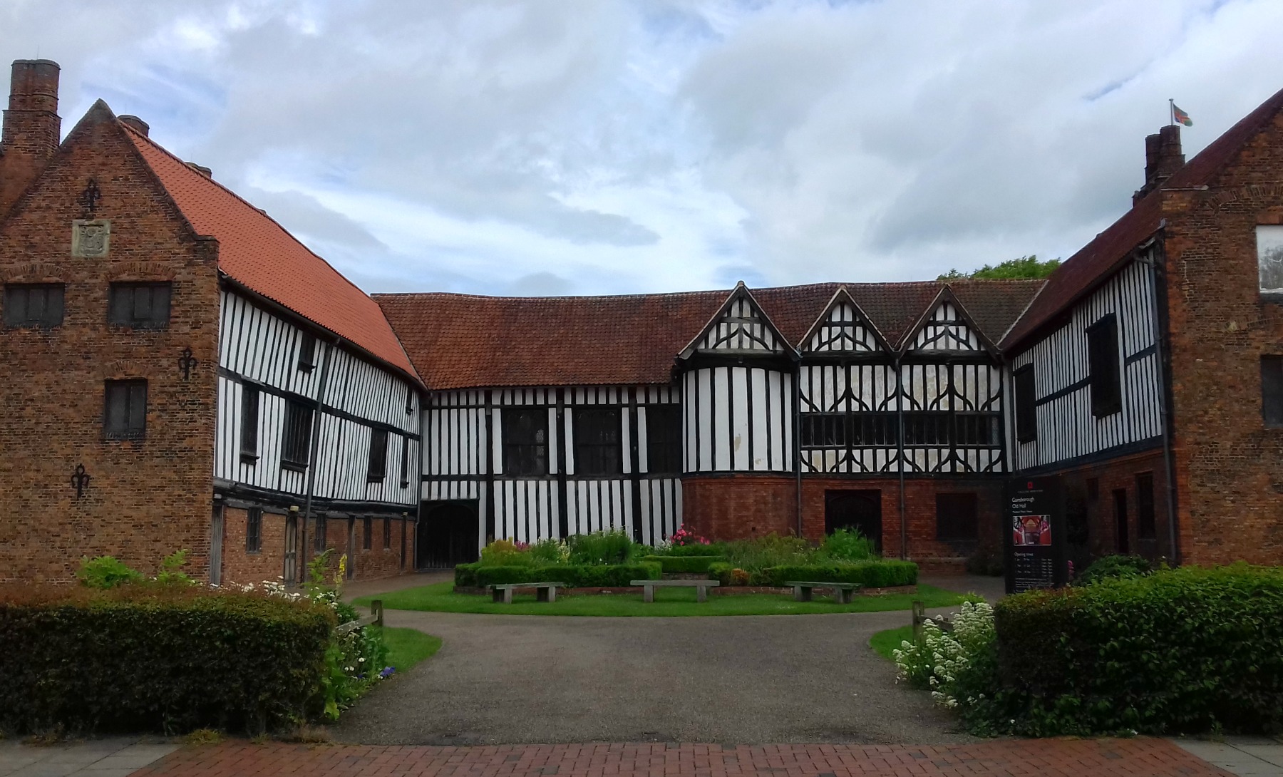 The site of this Hall is a little different to many other manors and stately homes we’ve visited, in that it’s in the middle of the town and therefore surrounded by streets and buildings. It also means that there is little in the way of grounds – although that would have been different centuries ago. So we headed into the grounds at the back of the Hall and stopped to glance at the information board: