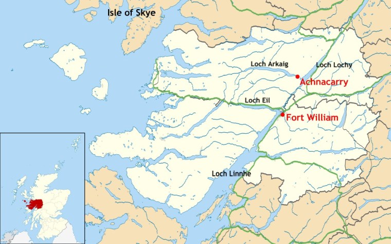 We chose to go for self-catering on this occasion and booked a sizeable apartment on the Lochiel Estate at Achnacarry (Achadh na Cairdh in Scottish Gaelic, meaning ‘field of the fish-trap/weir’). Achnacarry consists of a small hamlet, a private estate and a castle, and is located between Loch Lochy and Loch Arkaig in the Lochaber region of the Scottish Highlands (see map(s) above). The estate covers an area of 60,000 acres of beautiful and barren country with abundant wildlife including red and roe deer, foxes, badgers, Scottish wildcats pine martens and otters. Golden eagles, buzzards, peregrine falcons, merlins and sparrowhawks soar overhead and in the rivers and lochs are Atlantic salmon, trout and pike. In fact, the entire Lochaber region is stunningly beautiful, and has become known as ‘The Outdoor Capital of the U.K.
