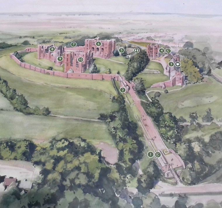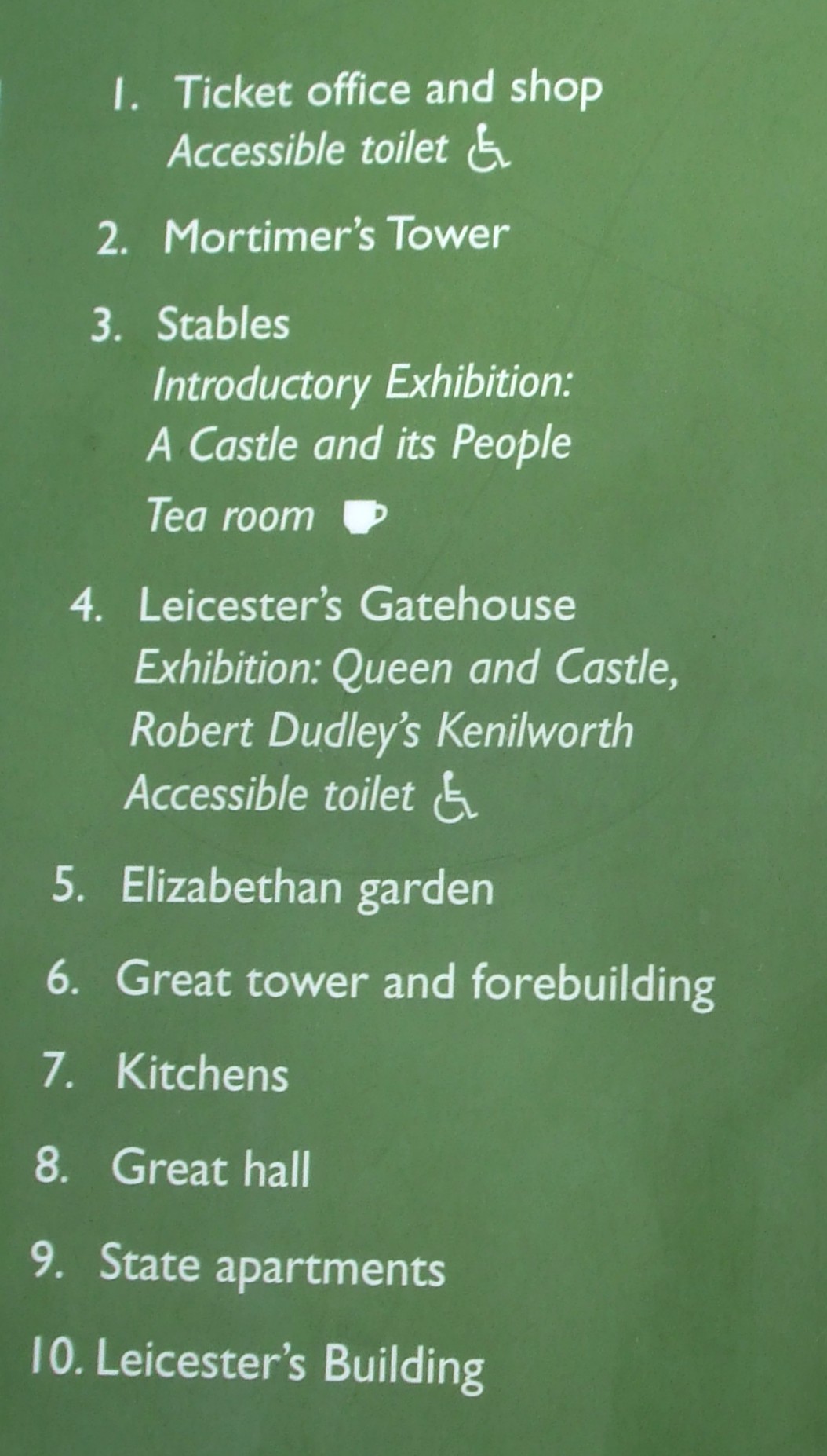 The following plan of Kenilworth Castle was on an information board near to the Entrance and Ticket Office (above). It shows the castle as it stands today. The key to the numbers is beneath it: