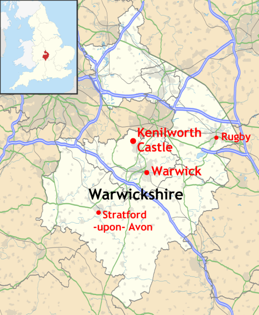 The location of Kenilworth Castle within Warwickshire, UK. Base map of Warwickshire from Nilfanion at Wikipedia.