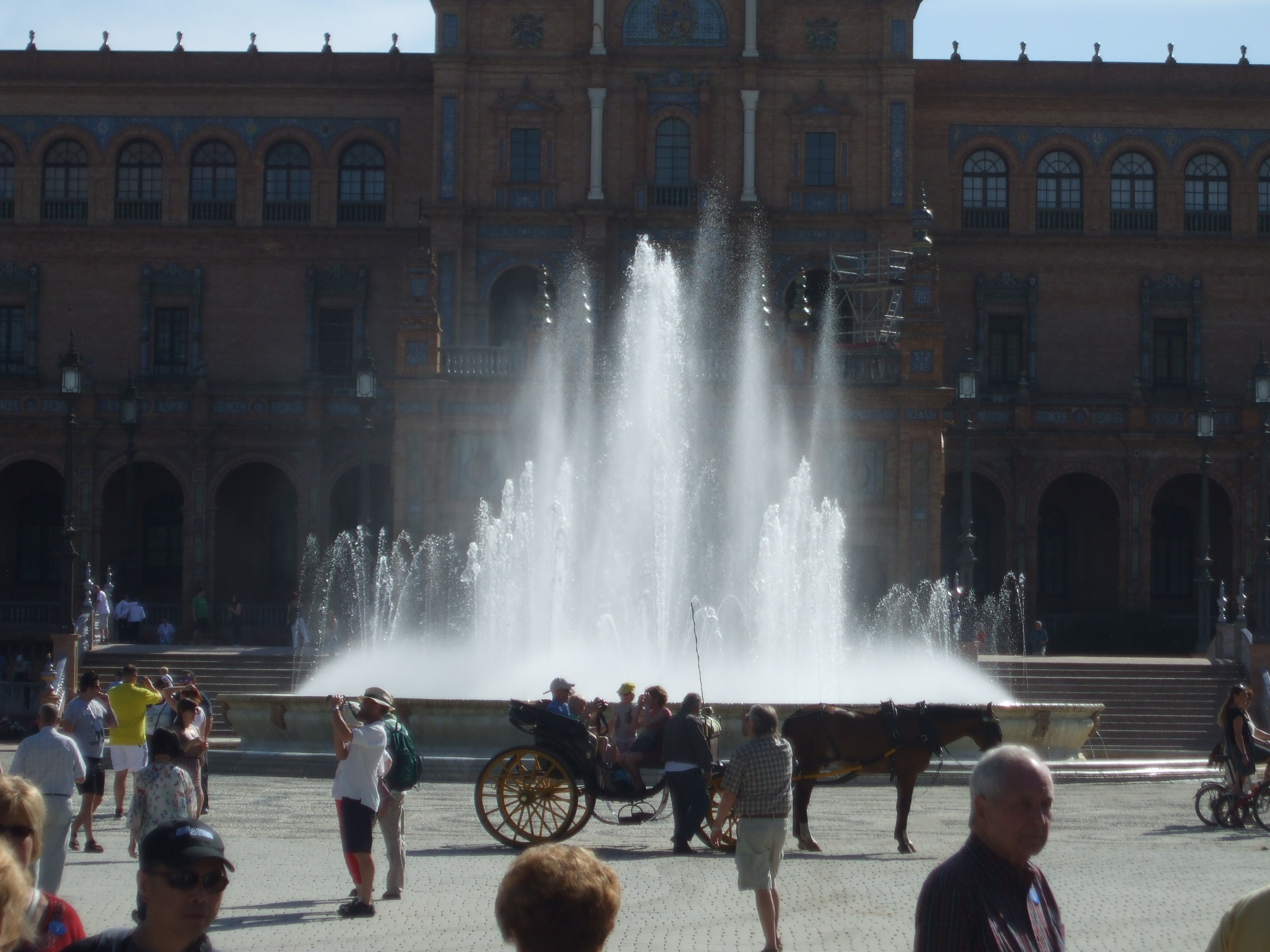 The city has much to offer tourists. Undoubtedly, the main attraction of the city is the Alhambra – a grand, Moorish citadel and palace, which most of this post will ultimately be about, but there are lots of other things to see and do in the city iteslf, if time allows. There are many shopping areas, from the ‘modern’ high street variety to the typical Spanish-style shops in the winding streets, offering Spanish leather, lace, olive oil products, wines and a variety of novelty items. Many spacious plazas host umpteen cafes, restaurants and tapas bars, all offering refreshments. We had lunch in one such plaza – probably the most popular and aptly aptly named Bib Rambla – with a statue entitled, ‘Fountain of the Giants’ in the middle of it.