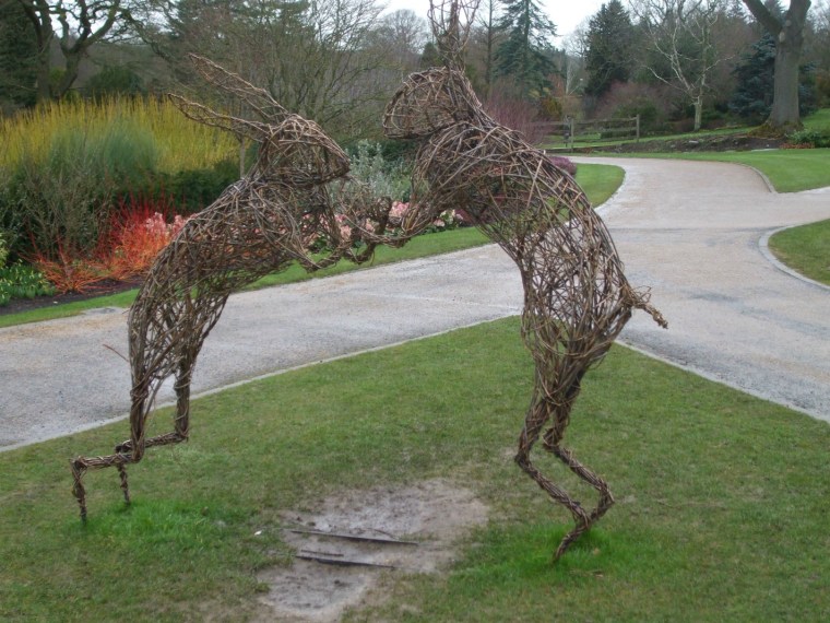 The month of March has long been associated with ‘madness’, which is largely based on the hilarious pre-mating rituals of hares at this time. ‘Boxing hares’ can be seen across the countryside during spring. My first image on this post shows a couple of wicker-built hares at Harlow Carr in Yorkshire doing just that.