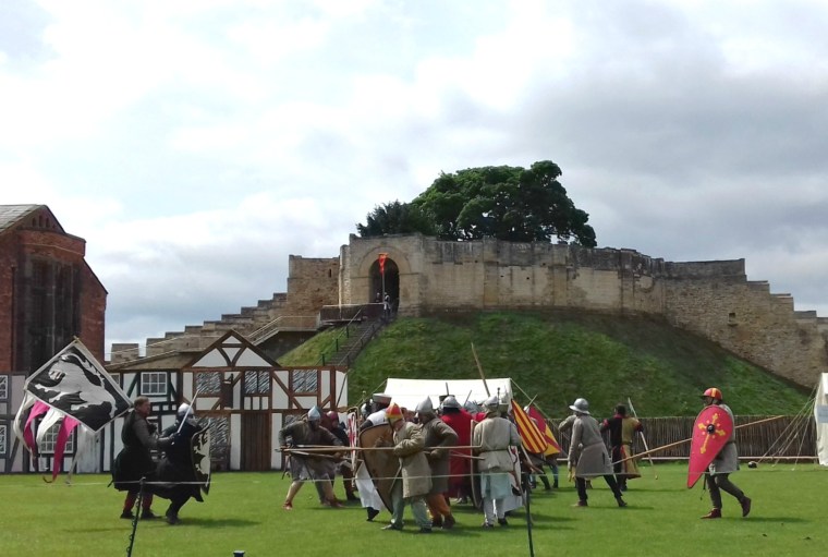 During the day, we watched three different events that took place at Lincoln. The first showed the arrival of the French at Lincoln and their attack on English defenders beneath the castle walls. The English are pushed back and those still alive flee up to the safety of the castle. The Comte du Perche, conspicuous with his shield displaying three chevrons, warns his men to be nice to the citizens of the city and pay for all their food and drink. It’s important to keep the people ‘on their side’!