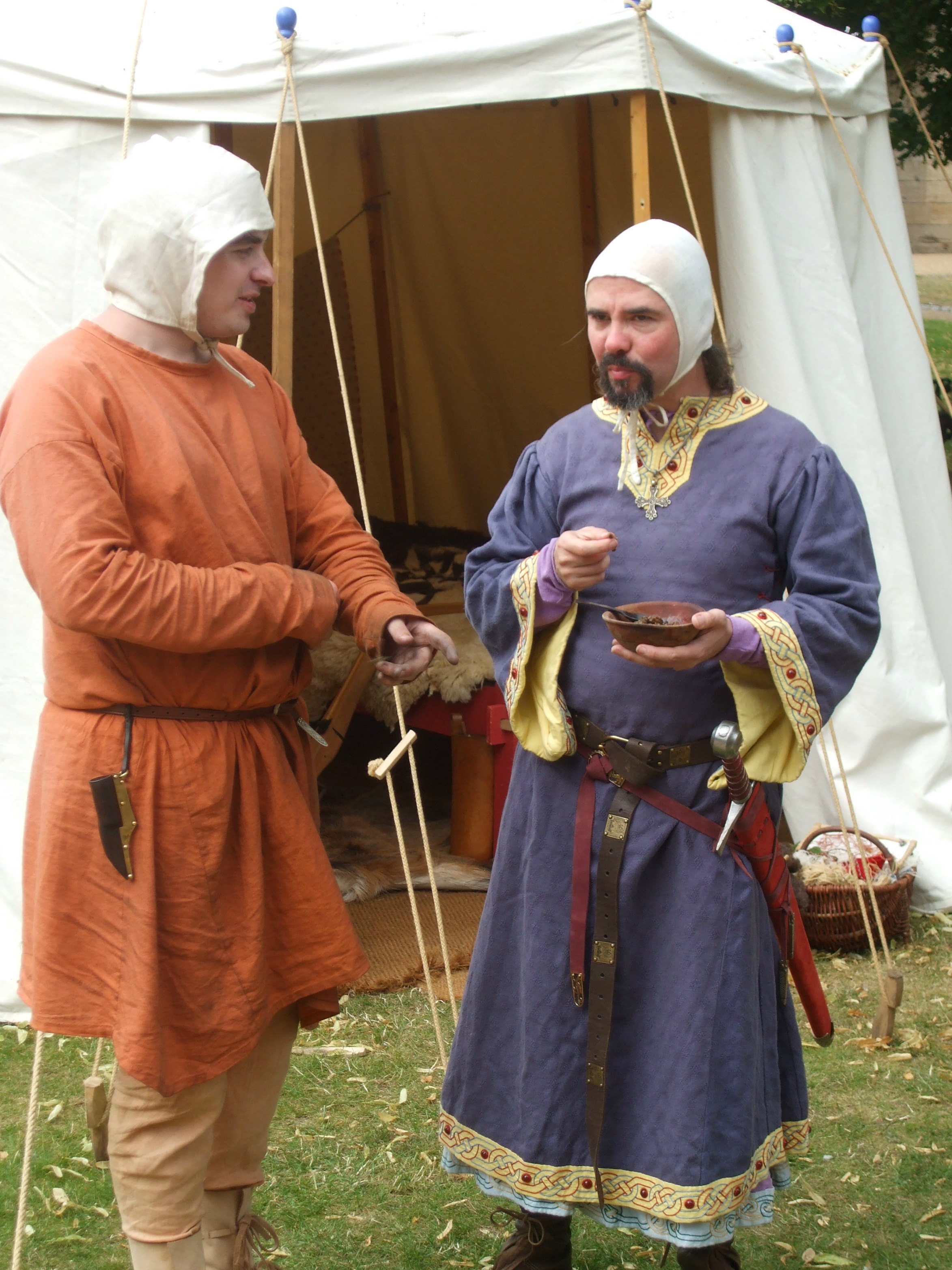 The weather was pleasant with bursts of sunshine, and everyone seemed to be having a great time. We got there around 10.30 am and had a walk round the bailey, generally ‘having a look’ at the encampment of the reenactors and various items and activities going on before the first part of the battle began. These are a few photos from around the camp. Lots of knights were about at this point, too: