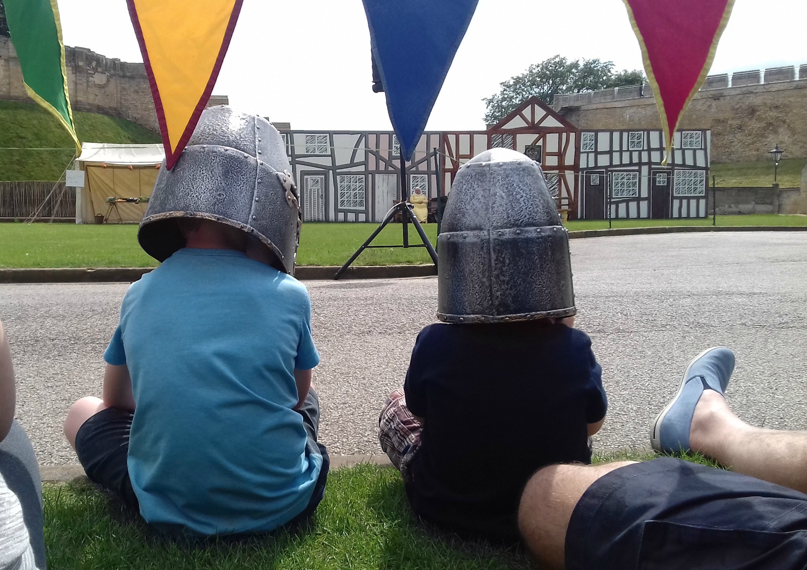 We attempted several videos of this battle but, unfortunately, there were so many spectators (and we got there too late after lunch!) to grab a good spot for photography. I managed to squat on the grass near the front – until these to two delightful little boys with buckets on their heads – in reality, replica battle helms – decided to take the space in front of me: