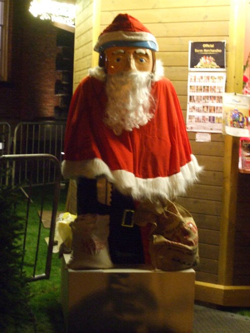 The run was scheduled to start at 11.30 am, but we got there well before 10 o’ clock, purely to make sure we found somewhere to park – and to find ourselves a ‘viewing spot’ near the front in order to take the photos. Last time we went, we were a long way back in the crowds and all I managed to see was the odd flash of red now and then. 😦 So we mooched about and took a few pics here and there of the organisers making the final preparations to the route, as well as the gathering santas and supporters.