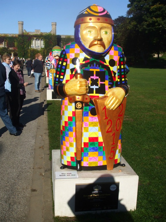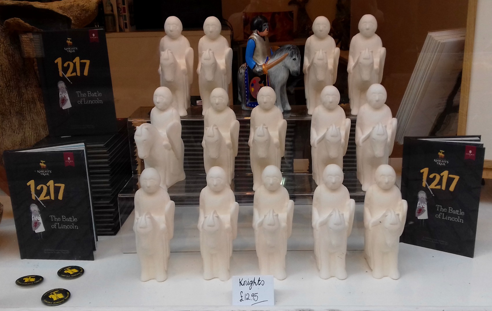 On Sunday we headed into Lincoln to finish photographing the 37 models of mounted knights displayed around central areas of the city for people to find. The activity is primarily aimed at children and is basically the same idea as that of the Barons’ Trail of 2015. Participants collect an entry form and location map from the Information Centre near the castle. On locating each knight they must examine it to find the hidden green shield and identify the word written on it from the key given with the map. Completed entry forms are returned to the Information Centre in exchange for a prize. With the Barons’ Trail, the prize was a bag of chocolate ‘coins’. On this occasion the prize is a badge and a voucher to buy a copy of the specially commissioned book about the Battle of Lincoln for £1.50 instead of £3.50.