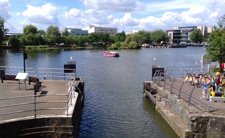 Lincoln is a city in two distinct parts: uphill and downhill. My first photo of this post shows a view from downhill Lincoln towards the cathedral uphill. The following photo is of the Brayford Pool, which is downhill (around which a few knights were lurking) with some of the university buildings in the background. So these knights were not exactly all in a cluster: