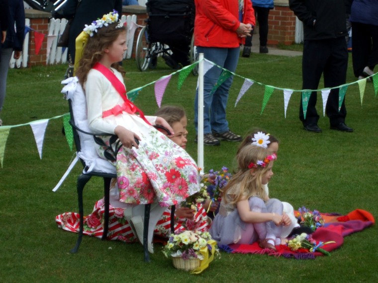 At one o’ clock we had the crowning of the May Queen. Traditionally the young woman chosen would have been one eligible for marriage, which in the past would have been a girl of perhaps fourteen upwards. Today’s May Queen was a cute little girl of eight. I suppose it makes sense, considering that it’s the primary schools who usually organise both the maypole dancing and crowning of the May Queen nowadays. Anyway, here is a photo of the ‘Queen’ and her little attendants as they watched the Morris dancers: