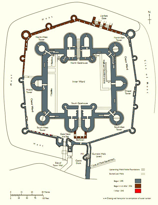 The symmetry of the castle is impressive (as evident on the above plan) although the skyline has been described as visually disappointing. It lacks the turrets of Caernarfon. Conwy and Harlech and has a definite squatness that fails to dominate its surroundings. This is because, although the work went on for 35 years, when it finally ceased in the 1330s, the towers of the inner ward were still without their top storeys and the planned turrets were never even started. There were plans for 5 separate suites of lavish accommodation, 3 of which remained unfinished. Unfortunately, Edward simply ran out of money.