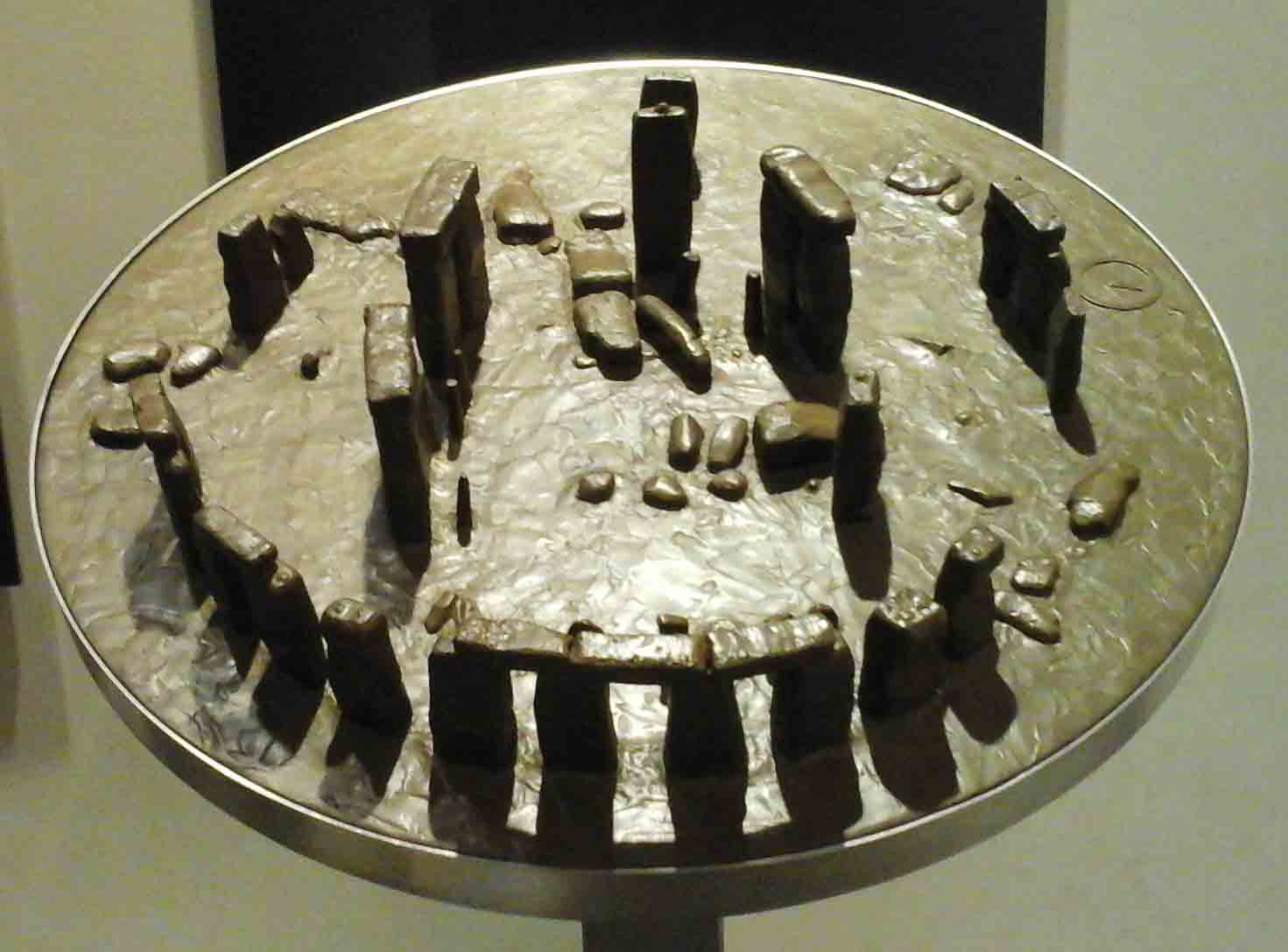 The first model above (left) shows the first major construction on the site, 5000 years ago, during the late Neolithic/New Stone Age. It was a circular enclosure with a ring of fifty-six pits which probably held upright pillars. Whether the pillars were wood or stone isn’t certain but it is likely there were some wooden ones in the enclosure. The chalk and earth from the enclosing ditch was used to make a large inner and smaller outer bank.