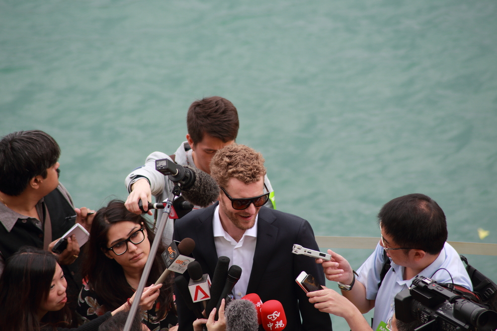 (Artist Florentijn Hofman surrounded by reporters. Shutterstock photo.)